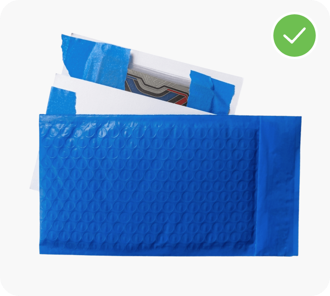 Don’t use a bubble mailer or padded mailer. Yes, we know some are thin and flexible, but just not worth the risk. And definitely don’t use thick cardboard or plastic; only thin postcard-weight.